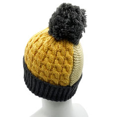 極太の糸を使い、1つの帽子に3つの緻密で立体感のある編みパターンを織り込んだ、他には無いとことんゴージャスなニット帽です。